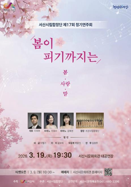 • [한식일보] 충남 서산시는 오는 3월 19일 오후 7시 30분 문화회관 대공연장에서 서산시립합창단 제17회 정기연주회 ‘봄이 피기까지는’이 개최된다고 밝혔다.