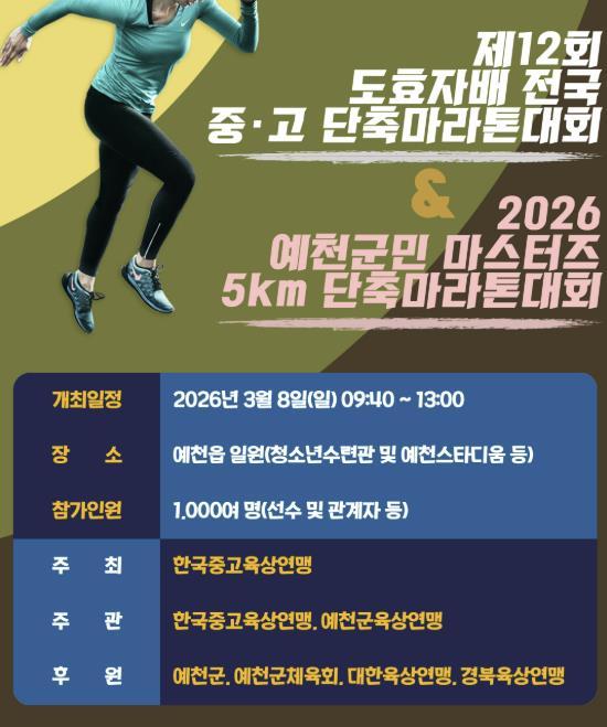 • [한식일보] 예천군은 오는 8일 오전 10시부터 예천읍 일원에서 '제12회 예천 도효자배 전국 중·고 단축마라톤대회' 및 '2026 예천군민 마스터즈 단축마라톤대회'를 개최한다고 밝혔다.