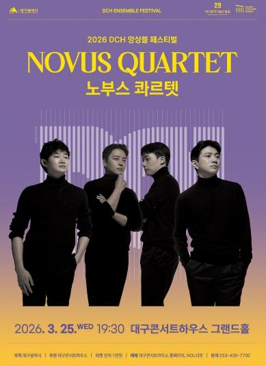 대구콘서트하우스(관장 박창근)가 선보이는 ‘2026 DCH 앙상블 페스티벌’의 대미를 장식할 하이라이트 무대가 찾아온다. 세계적인 현악사중주단 ‘노부스 콰르텟(Novus Quartet)’의 공연이 오는 3월 25일 오후 7시 30분 대구콘서트하우스 그랜드홀에서 열린다.