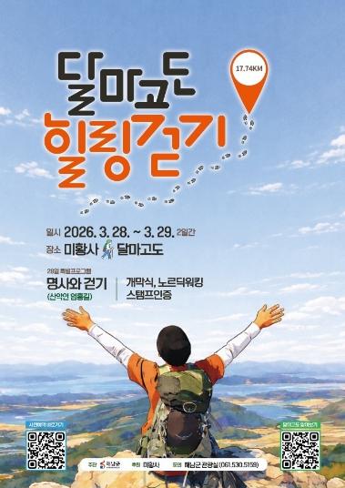 송지면 달마산 일원에서 열리는‘2026 땅끝해남 달마고도 힐링걷기’는‘걷는 순간이 곧 힐링’이라는 테마로 걷기 중심의 프로그램을 통해 방문객들이 달마고도 천혜의 자연 속에서 걸으며 몸과 마음을 힐링 할 수 있는 기회를 제공할 계획이다.