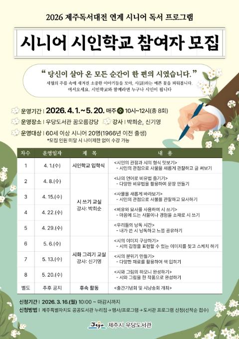 • [한식일보] 제주시 우당도서관은 2026 제주독서대전과 연계해 시민의 삶과 경험을 문학적 가치로 재발견하는 특별 프로그램인 ‘시니어 시인학교’ 참여자를 모집한다.