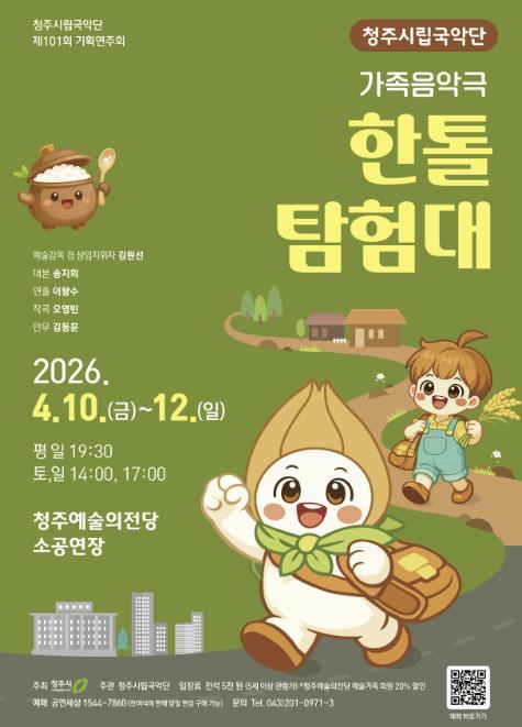 • [한식일보] 청주시립국악단은 4월 10일부터 12일까지 3일간 청주예술의전당 소공연장에서 제101회 기획연주회 가족 음악극 ‘한톨탐험대’를 개최한다고 19일 밝혔다.