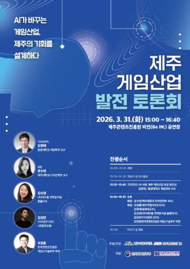 • [한식일보] 제주특별자치도가 인공지능(AI) 시대 게임산업을 새로운 성장동력으로 육성하기 위한 토론회를 오는 31일(화) 오후 3시 제주콘텐츠진흥원 비인(BeIN;)공연장에서 개최한다.