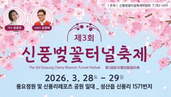 • [한식일보] 서귀포시는 몸과 마음이 가벼워지는 따스한 봄, 가족・연인・친구 간의 잊지 못할 추억을 선사할 제3회 신풍벚꽃터널축제가 28일~29일 양일간 성산읍 풍요정원 및 신풍리레포츠 공원 일원에서 개최된다고 밝혔다.