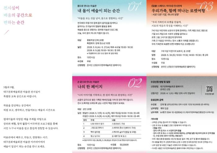 김희철 대구문화예술회관 관장은 “뮤지엄 아카데미는 작품을 감상하는 공간을 넘어, 직접 경험하고 참여하는 배움의 공간으로 확장하는 프로그램”이라며 “시민들이 일상 속에서 예술을 더욱 가까이 느끼는 계기가 되기를 기대한다”고 말했다.