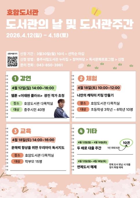 • [한식일보] 충주시 호암도서관은 제4회 ‘도서관의 날’과 제62회 ‘도서관주간’을 맞아 4월 12일부터 18일까지 7일간 다채로운 독서문화 행사를 운영한다고 2일 밝혔다.