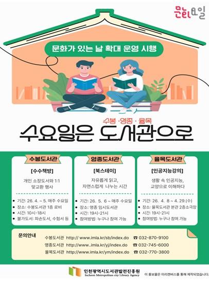 [한식일보] 인천광역시는 매월 마지막 주 수요일에 운영하던‘문화가 있는 날’을 오는 4월부터‘매주 수요일’로 전격 확대한다고 밝혔다. 대상은 관내 수봉·영종·율목도서관 3개소다.