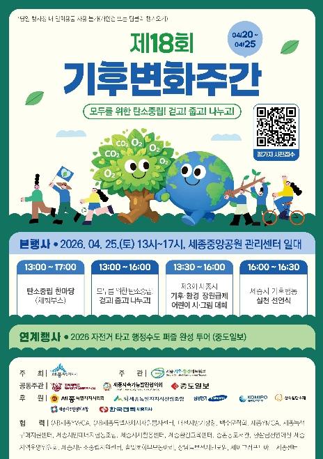 • [한식일보] 세종특별자치시가 20일부터 25일까지 6일간 중앙공원 일대에서 ‘제18회 기후변화주간’ 행사를 개최한다.
