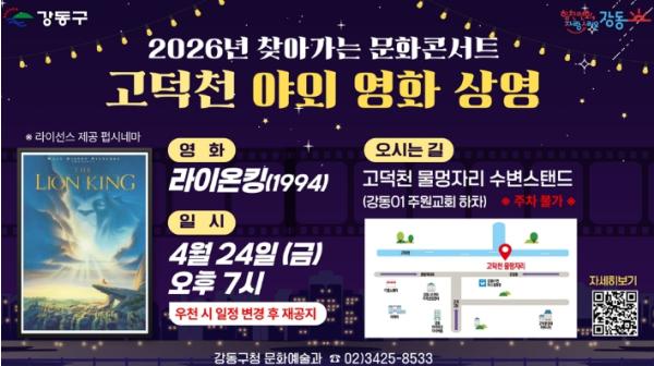 • [한식일보] 서울 강동구는 오는 24일 오후 7시, 고덕천 물멍자리 수변스탠드(주원교회 맞은편)에서 ‘2026년 찾아가는 문화콘서트’ 3회차 프로그램으로 미디어파사드를 활용한 야외 영화 상영을 진행한다고 밝혔다.