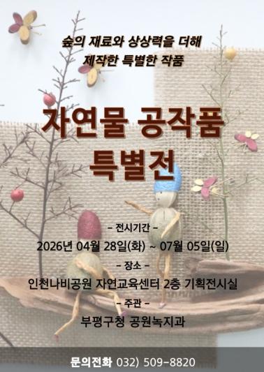 • [한식일보] 부평구는 부평숲 인천나비공원에서 오는 28일부터 ‘자연물 공작품 특별전’을 개최한다고 밝혔다.